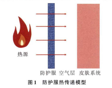 在人體-服裝-環(huán)境復(fù)雜傳熱中,化學(xué)防護(hù)服介于火源和人體之間,充當(dāng)一種介質(zhì),其主要作用是阻止或減緩熱量向人體的傳遞,降低高溫環(huán)境對人體的威脅,故防護(hù)服的熱防護(hù)性能是評估熱防護(hù)服必備的指標(biāo)。因此,研究熱防護(hù)服在人體-服裝-環(huán)境之間的熱傳遞,對評估以及改進(jìn)防護(hù)服的熱防護(hù)性能具有重要意義。