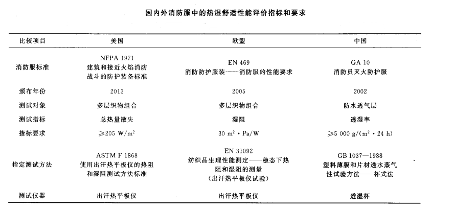 消防服相關(guān)標準對熱濕舒適性的要求