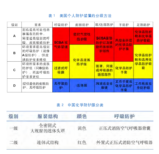 國內(nèi)標準GA 770-2008《 消防員化學防護服》中參考了USA的標準,對化學防護服的分類標準進行了簡化,如表2所示。我國的一級防護裝備等同于USA的A級防護,二級就是A級以下的防護裝備了。