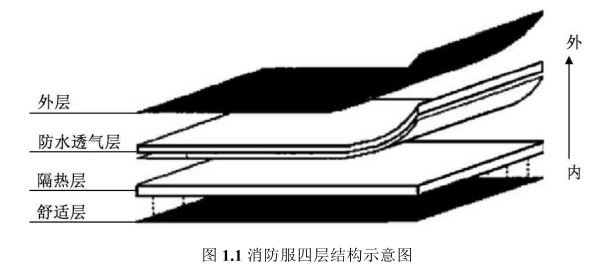 阻燃外層(最外側(cè))、防水透氣層、隔熱層及舒適層(靠近皮膚-側(cè))。阻燃外層直接接觸復(fù)雜的火場環(huán)境,需要有阻燃性能和一定的物理性能;外表層內(nèi)部是防水透氣層,起到防水、防蒸汽以及防止有害物質(zhì)滲透的作用;隔熱層的作用是了阻止熱量傳導(dǎo)至內(nèi)部;舒適層為靠近皮膚一層,使穿著者體感更舒適。