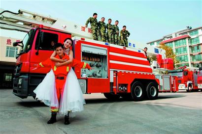 身著消防服和穿著潔白婚紗的一對新人以登高車、訓(xùn)練塔、搜救犬等為背景,那些曾經(jīng)號稱時(shí)尚、古典、樸素、奢華的最美婚紗照們,在這一刻被徹底的秒殺了,就是依靠這些簡單元素使一對新人一下子“火”了。