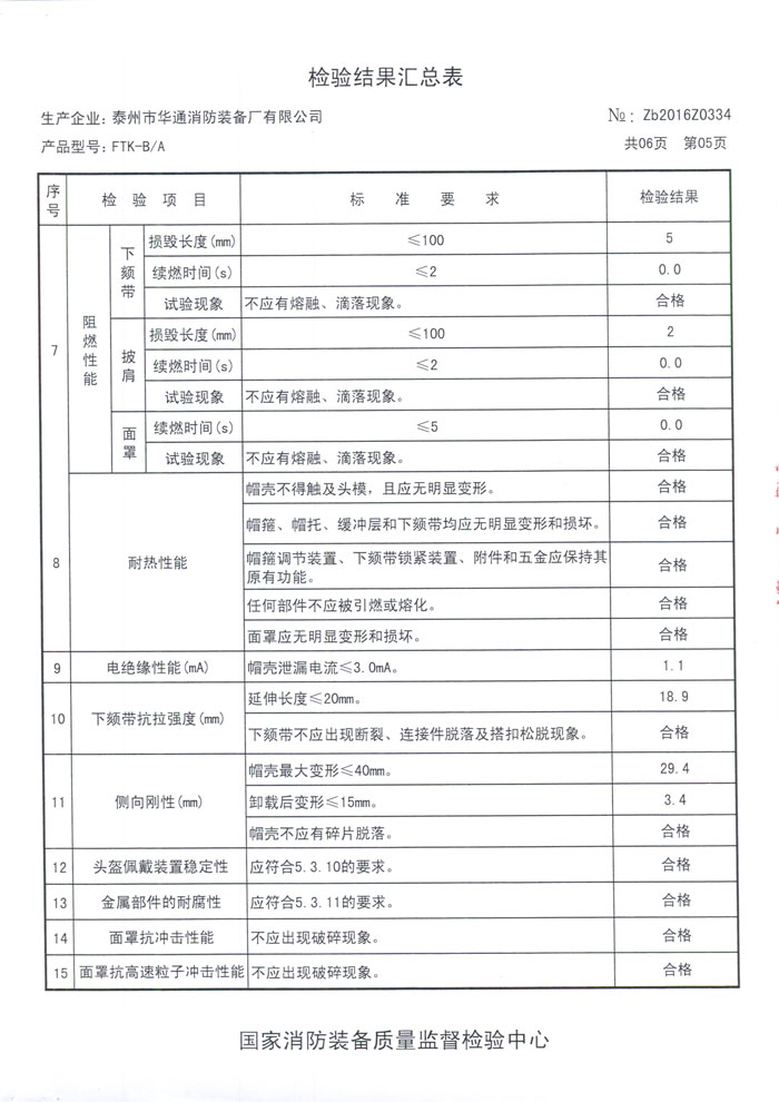 華通消防新型消防頭盔FTK-B/A符合GA44-2015標(biāo)準(zhǔn),CNCA-C18-04:2014《強(qiáng)制性產(chǎn)品認(rèn)證實(shí)施規(guī)則 消防裝備產(chǎn)品》,CCCF-XFZB-01《強(qiáng)制性產(chǎn)品認(rèn)證實(shí)施細(xì)則 消防裝備產(chǎn)品 消防員個(gè)人防護(hù)裝備產(chǎn)品》。沖擊吸收性能:最大沖擊力≤3780N,帽殼沒(méi)有碎片脫落,帽托亦沒(méi)有損壞和斷裂,帽箍于帽殼的連接機(jī)構(gòu)沒(méi)有損壞和斷裂??箾_擊加速度性能:帽頂部最大沖擊加速度≤150gn;帽前部最大沖擊加速度≤400gn;帽側(cè)部最大沖擊加速度≤400gn;帽后部最大沖擊加速度≤400gn。耐燃燒性能在火源離開(kāi)帽殼后,帽殼火焰在5s內(nèi)自熄,沒(méi)有火焰燒透到帽殼內(nèi)部跡象,帽殼沒(méi)觸及頭模,且無(wú)明顯變形,帽箍、帽托、緩沖層和下頦帶均無(wú)明顯變形和損壞,任何部件都無(wú)被引燃或融化。